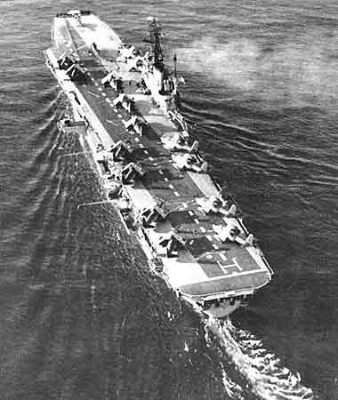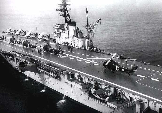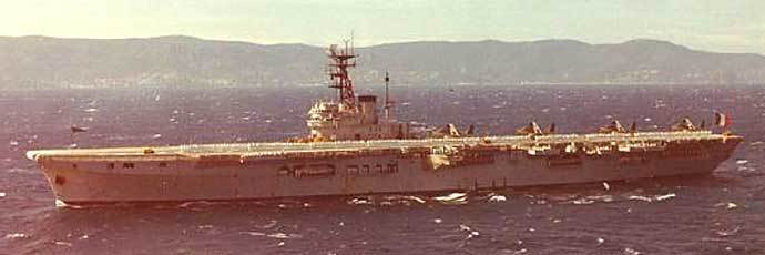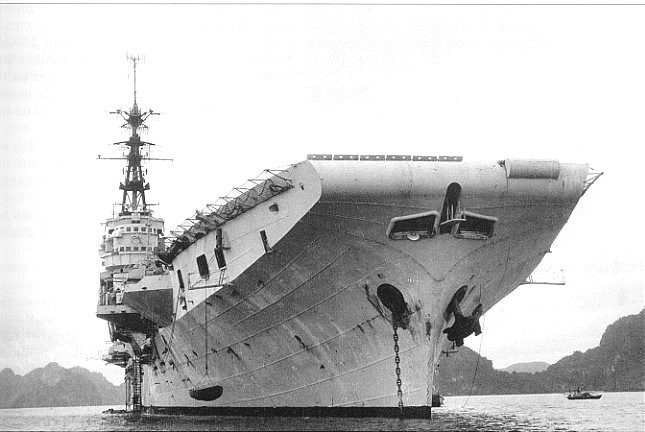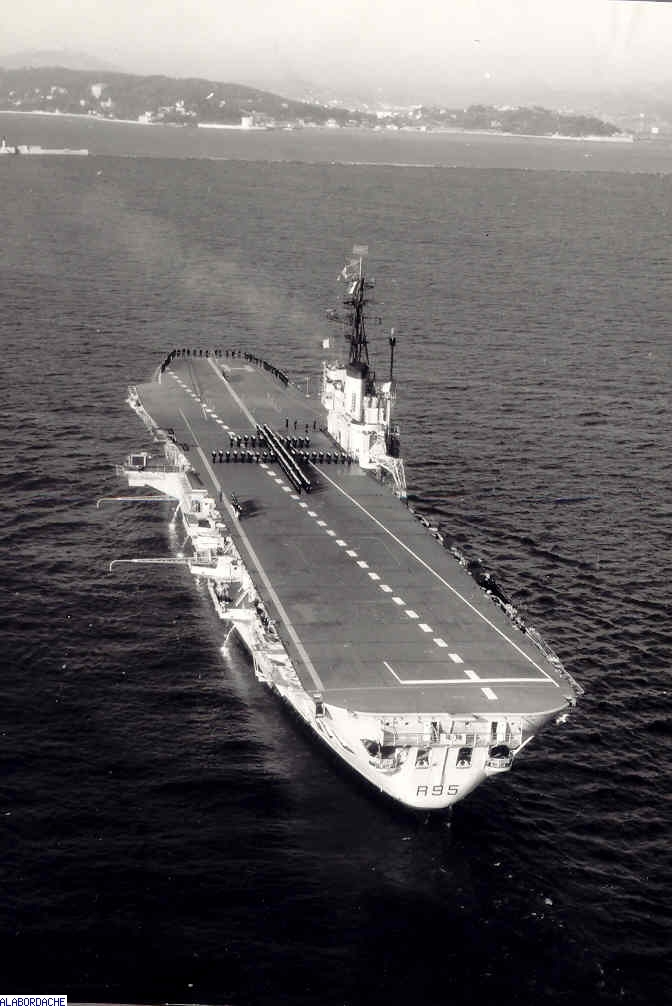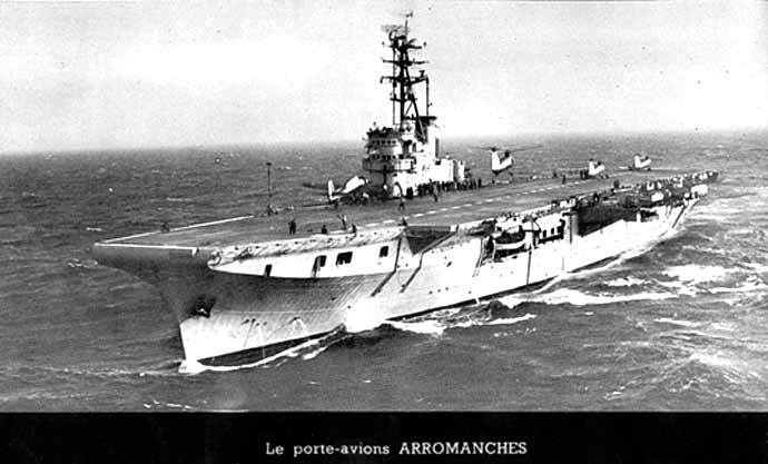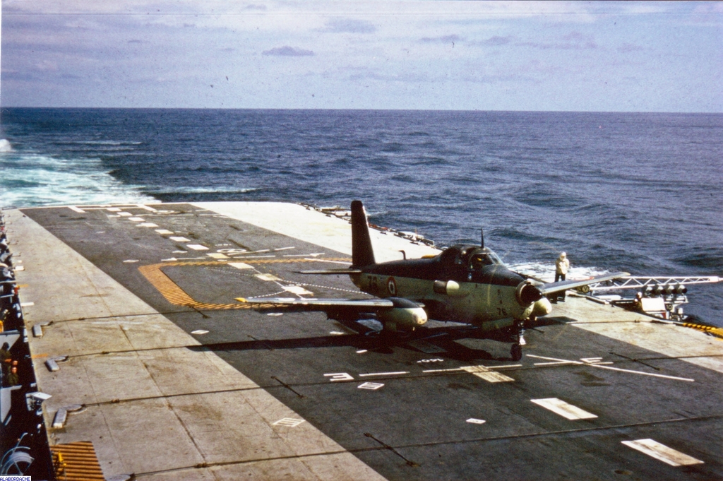 1962 : Sur le plont d'envol de l'Arromanches, devant un "Corsair"