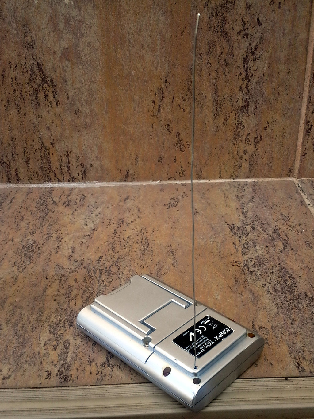 Rozdělal jsem vysílač a zjistil, že anténa je realizována drátkem s izolací, který byl uvnitř stočen okolo obvodových hran a tvořil tak písmeno "U". Po natažení a změření drátku - 16,5cm. Takže jsme doma.